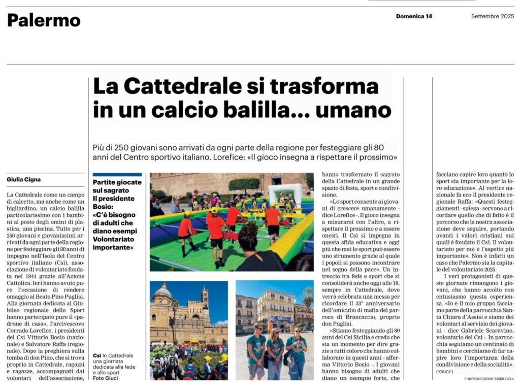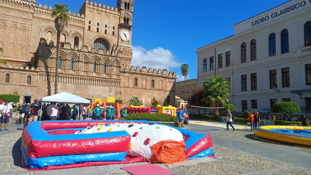 250 giovani da tutta la Sicilia, con una festa all’insegna dello sport e del gioco, hanno animato lo scorso 13 settembre 2025 il sagrato della Cattedrale di Palermo. Un vero e proprio Villaggio dello sport organizzato in occasione della celebrazione degli “80 anni di Sport e di Impegno a Servizio della Comunità Siciliana” del Centro Sportivo Italiano – Comitato Regionale Sicilia: un traguardo storico per l’associazione ma anche un’occasione di slancio verso il futuro. Da 80 anni, infatti, il CSI è una presenza viva e capillare in Sicilia: un’esperienza di sport educativo e popolare che coinvolge giovani, allenatori, arbitri, dirigenti, parroci ed educatori, offrendo opportunità di crescita, incontro, ascolto e accoglienza.