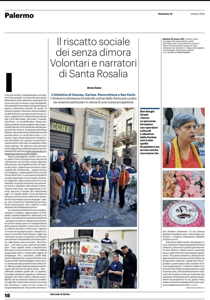 Come testimoniato dalle numerose persone che hanno preso parte all’iniziativa, l’esperienza ha toccato profondamente i partecipanti. Le guide, formate grazie al progetto della Caritas in collaborazione con il centro di accoglienza San Carlo e altri servizi territoriali, hanno saputo raccontare Palermo con competenza e passione, portando i visitatori alla scoperta di luoghi iconici e altri meno conosciuti con il filo conduttore delle Edicole Votive di Santa Rosalia.