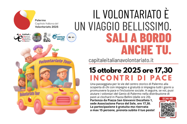 Il successo de “La via di Rosalia” rilancia con ancora più entusiasmo il prossimo appuntamento del Volontariato Tour, in programma per martedì 15 ottobre alle ore 17:30. Questa volta la passeggiata sarà all’insegna della pace e dell’inclusione sociale, in un percorso che attraversa il centro storico toccando quattro realtà solidali che operano quotidianamente per costruire ponti tra culture, etnie e generazioni.