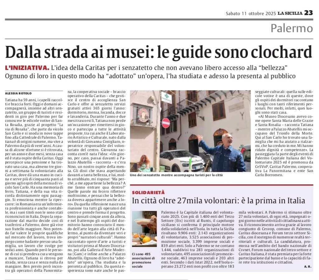 Dopo la “tappa 0” dello scorso 30 luglio nel quartiere Sperone, alla scoperta della rinascita dal basso di una periferia protagonista di rigenerazione urbana e volontariato, l’11 e 12 ottobre, il centro di Palermo si è trasformato in un percorso vivente della solidarietà, con protagonisti d’eccezione: i senza dimora ospiti del centro di accoglienza La Panormitana della Caritas. Narratori unici che hanno accompagnato turisti e cittadini attraverso le vie della città, condividendo non solo la storia e la bellezza dei luoghi, ma soprattutto le loro storie personali, quelle di chi ha conosciuto la strada e ha trovato nella solidarietà una nuova dignità e un’opportunità di riscatto.