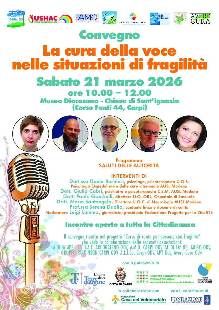 Il convegno rientra nel progetto “Corso di canto per persone con fragilità” che vede la collaborazione delle seguenti associazioni: A.DI.FA APS, U.S.H.A.C. ARCOBALENO ODV, A.M.O. CARPI ODV, AL DI LA’ DEL MURO ODV, GRUPPO PARKINSON CARPI ODV, A.L.I.Ce. Carpi ODV, APT Odv, Avere Cura Odv.