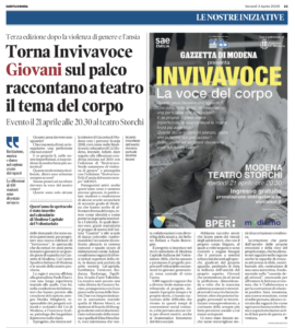 L’appuntamento è in programma il 21 aprile alle ore 20:30 presso il Teatro Storchi a Modena, uno dei luoghi simbolo della scena culturale cittadina, ingresso gratuito, biglietti qui: https://www.vivaticket.com/it/ticket/invivavoce-la-voce-del-corpo/299318