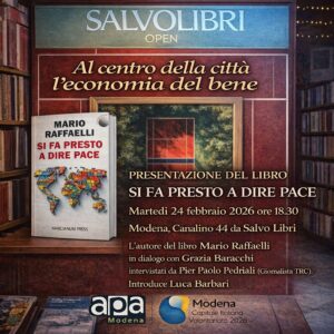 L’incontro si terrà martedì 24 febbraio 2026 alle ore 18.30, presso Salvo Libri (Via Canalino 44, Modena). L’evento sarà condotto da Pier Paolo Pedriali, giornalista di TRC Modena e Presidente dell’Associazione Stampa Modenese, che intervisterà l’autore.