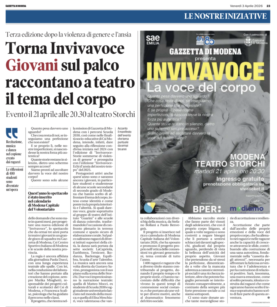 Continua a leggereIl 21 aprile 2026 i giovani protagonisti sul palco del Teatro Storchi di Modena con “Invivavoce – La voce del corpo”