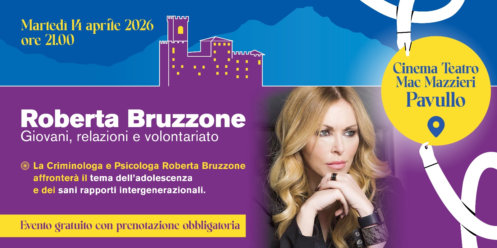 Giovedì 14 maggio 2026 alle ore 21.00, presso il Cinema Teatro Mac Mazzieri di Pavullo, si terrà un incontro pubblico con Roberta Bruzzone, criminologa e psicologa, dedicato al tema “Giovani, relazioni e volontariato”.