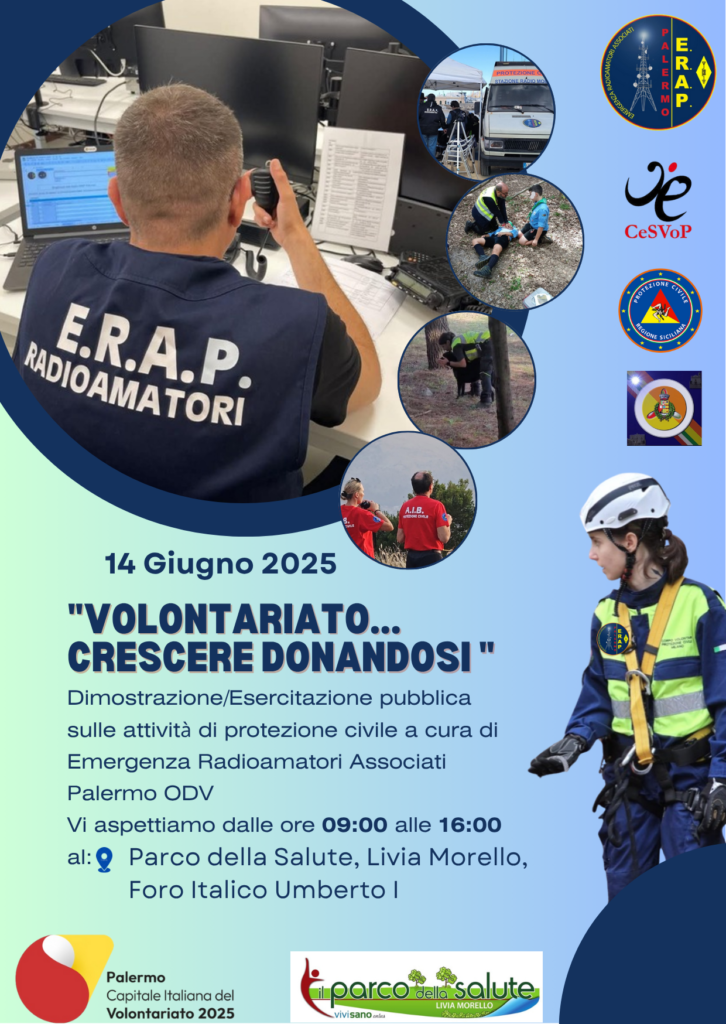 L’evento “Volontariato… Crescere Donandosi”, organizzato dall’Emergenza Radioamatori Associati Palermo ODV (ERAP), in collaborazione con Vivisano ONLUS, Dipartimento regionale di Protezione civile SiciliaCeSVoP, si inserisce nel calendario di iniziative di Palermo Capitale Italiana del Volontariato 2025.